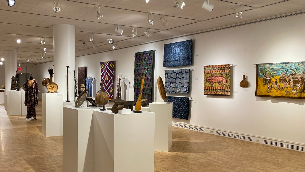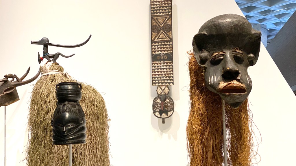 The Nasher accepted 27 pieces, including the falui mask at left. A Wolof ngoni (guitar) was displayed as part of the Cosmic Rhythm Vibrations exhibit.